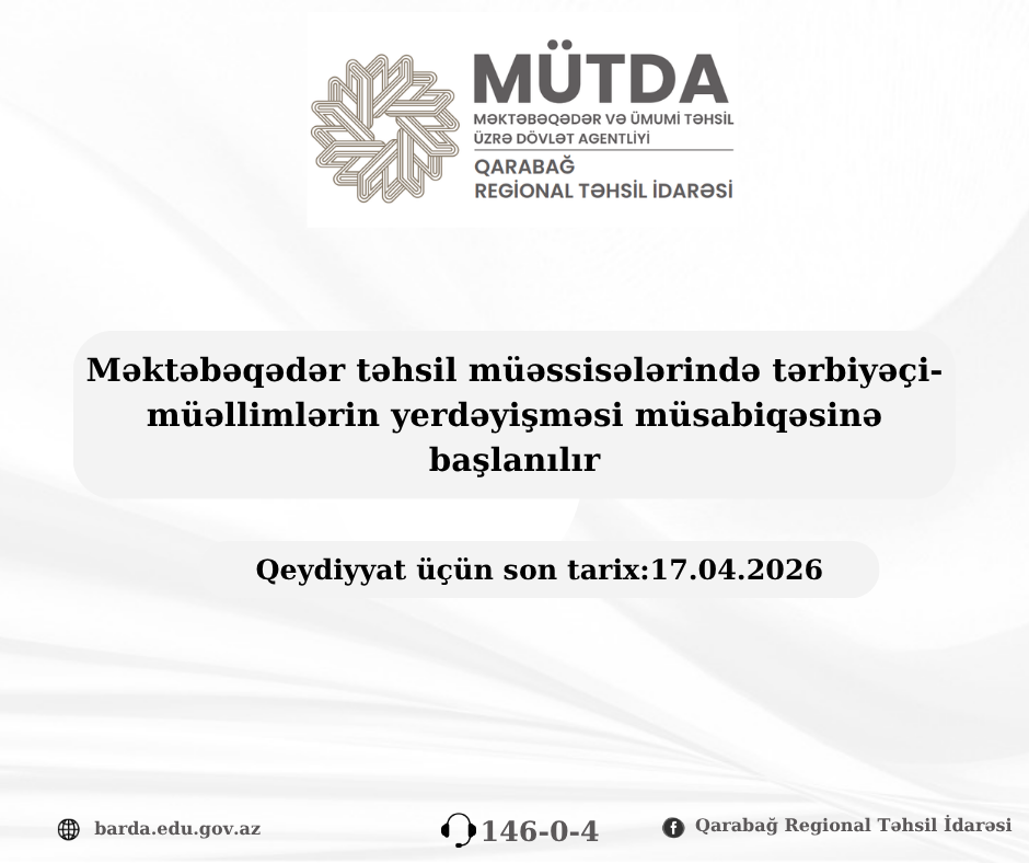 Qarabağ Regional Təhsil İdarəsinin tabeliyindəki dövlət məktəbəqədər təhsil müəssisələrində vakant olan tərbiyəçi-müəllim vəzifələrinə yerdəyişmə prosesinə qeydiyyat başlayır.